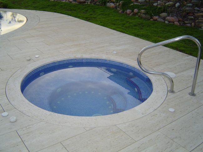 Piscina desbordante (Sitges) en forma de con coronamiento de mármol travertino y jacuzzi con sistema de impulsión de aire y masajes aire-agua.
