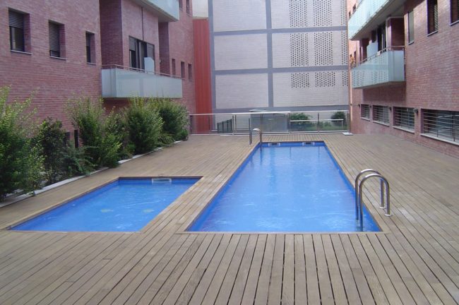 Piscinas para Comunidad de Propietarios (Granollers) realizadas por el sistema tradicional de skimmers y acabado de las playas en madera. Dispone de una piscina infantil para niños.