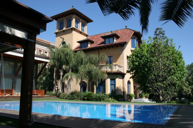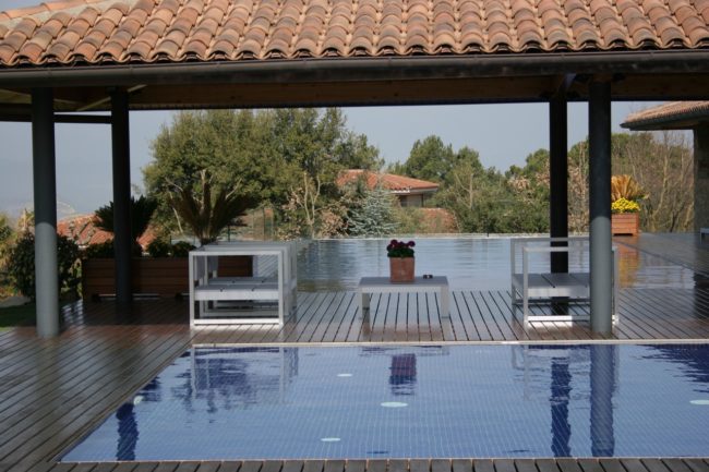 Piscina desbordante (Taradell) rectangular mediante un perfil de acero inox. Con éste sistema la lámina de agua queda al mismo nivel que la tarima exterior. Dispone de ventanas subacuaticas que dan al interior de la vivienda. También se puede apreciar una piscina infantil de poca profundidad y las mismas características que la otra.